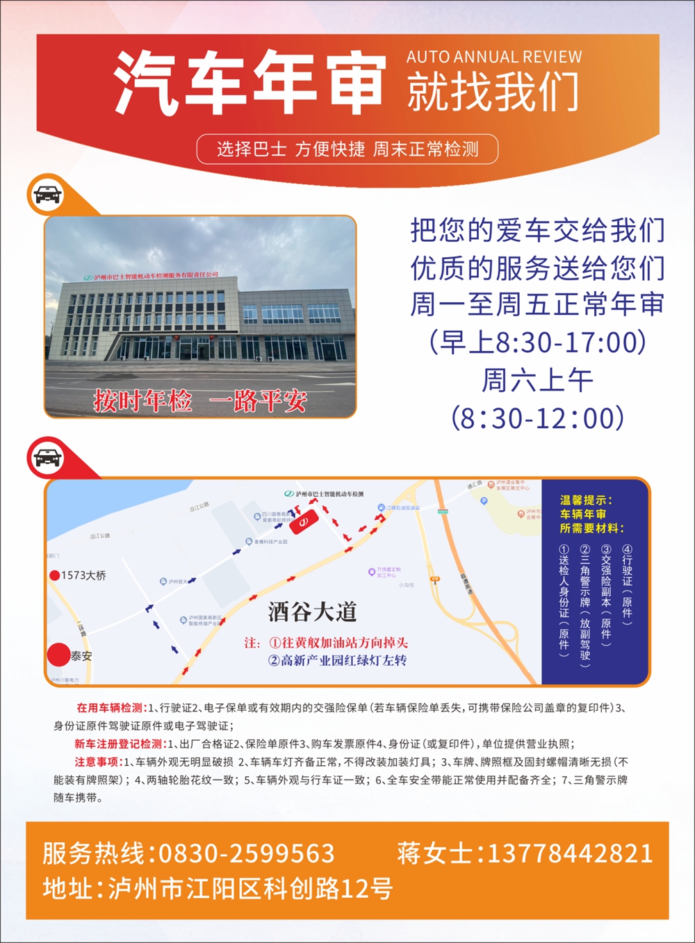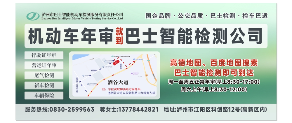 瀘州市巴士智能機動車檢測服務(wù)有限責任公司占地面積地20余畝,是瀘州市公交集團全資子公司,位于瀘州市江陽區(qū)科創(chuàng)路12號(高新區(qū)內(nèi))。檢測場站服務(wù)項目齊全、設(shè)備先進、管理規(guī)范、實力雄厚,檢測人員優(yōu)秀,技術(shù)力量精湛。本公司堅持“公正公平、科學(xué)準確、以人為本、高效服務(wù)”的宗旨,一切為客戶著想,全面為客戶提供規(guī)范檢測、誠信服務(wù),為受檢車輛提供可靠的檢測數(shù)據(jù),為瀘州市機動車安全運行提供支撐和保障。